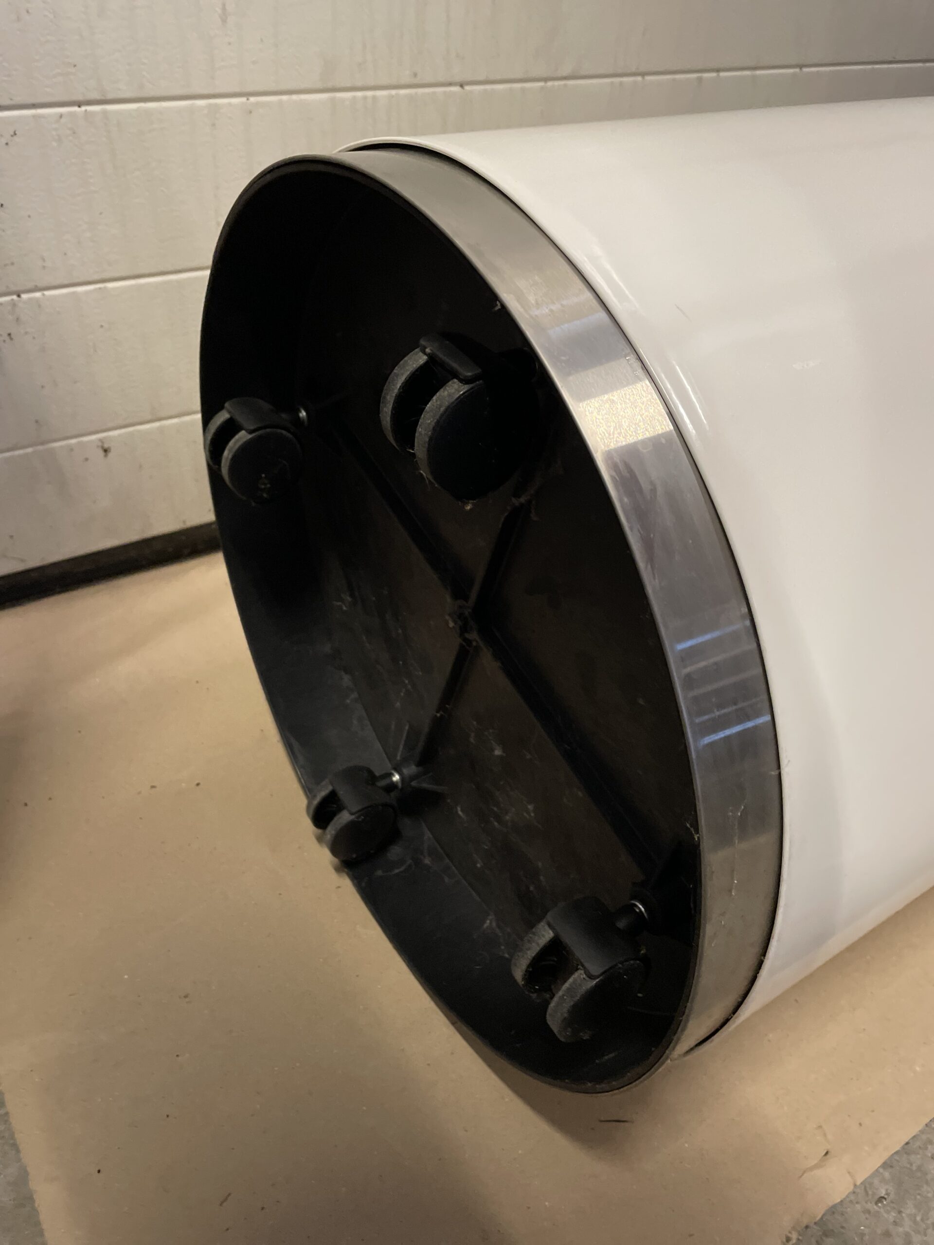 Cirkelkumme med rustfri sokkel og skjulte hjul.