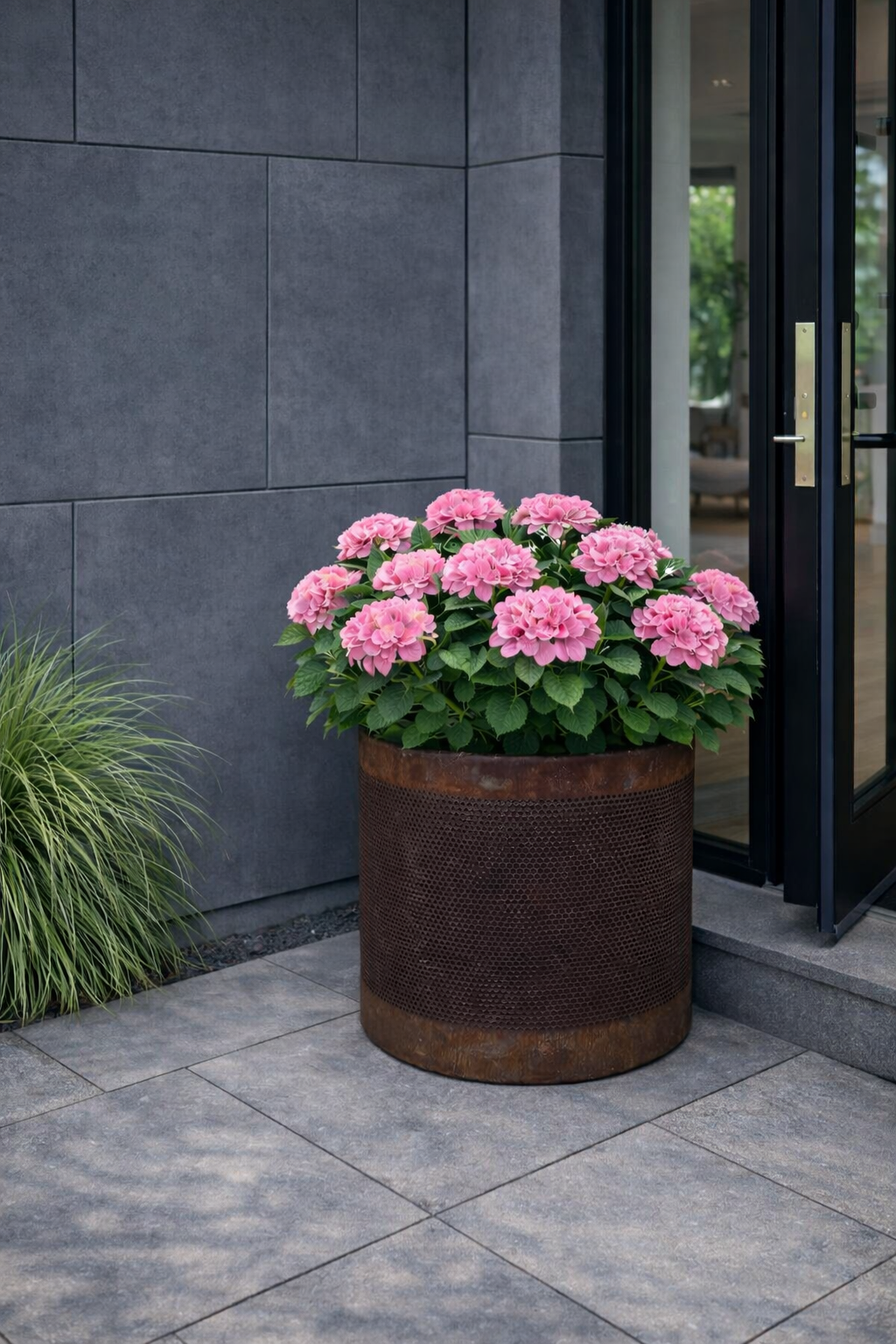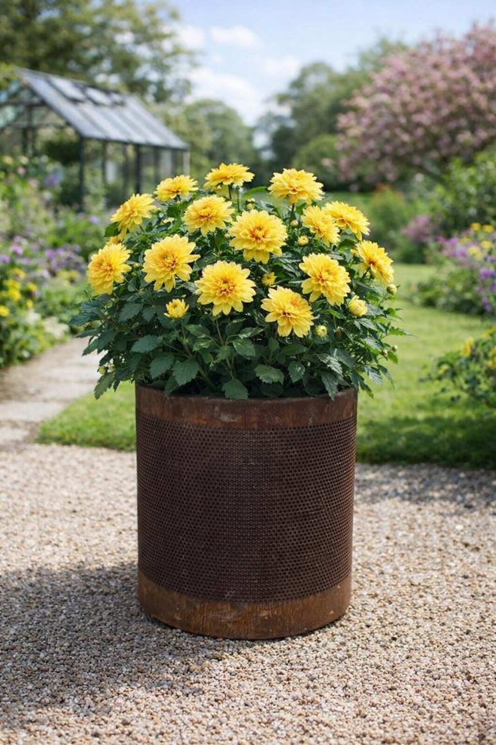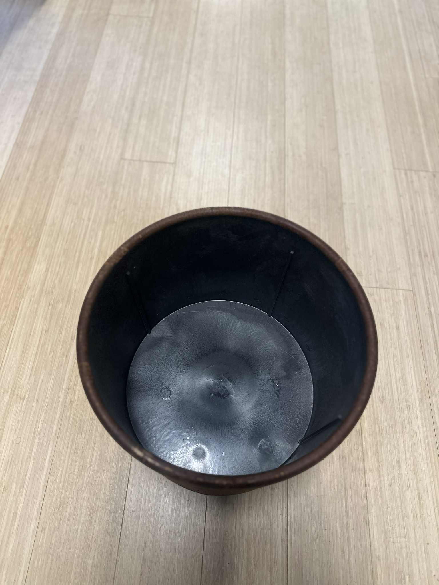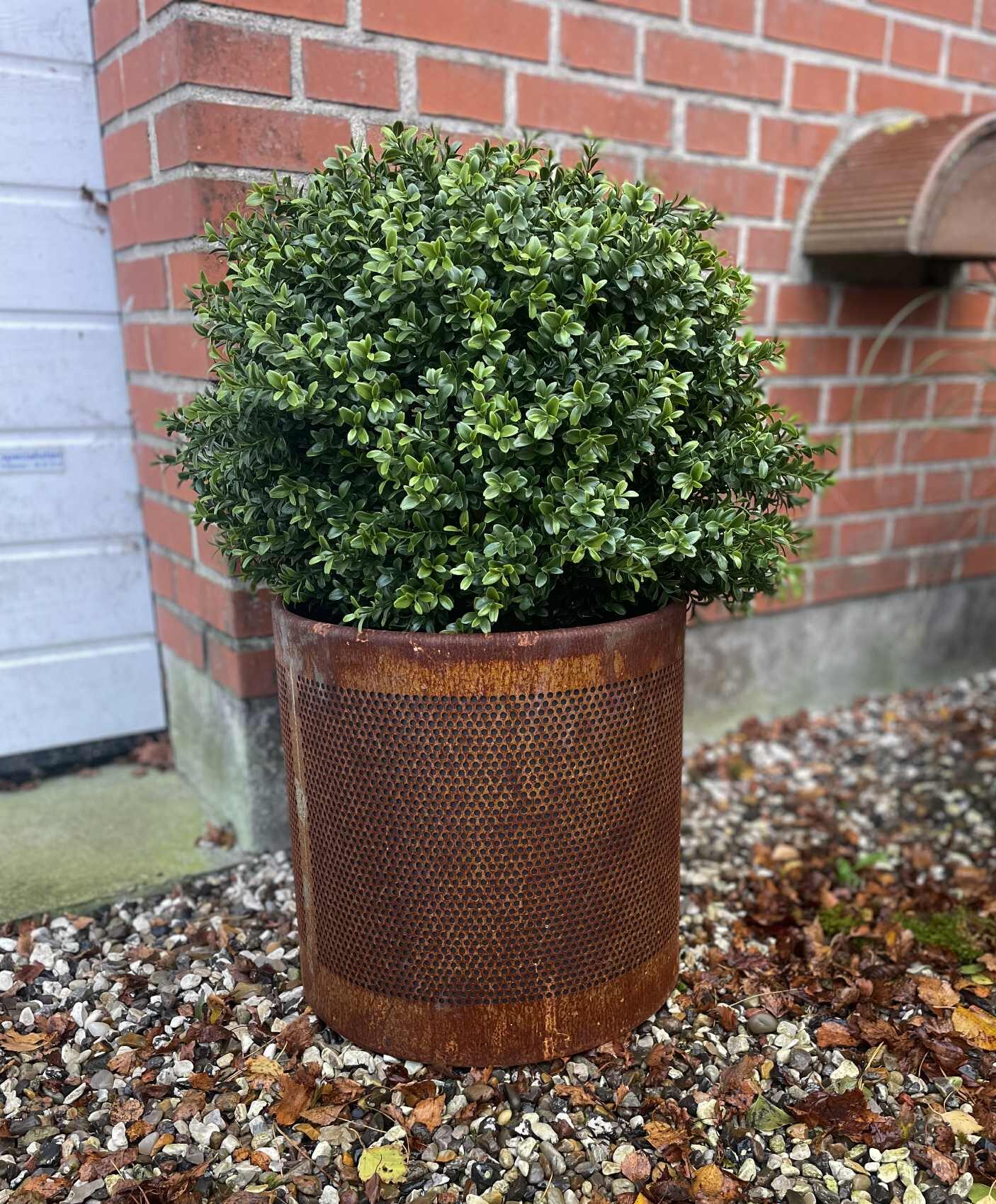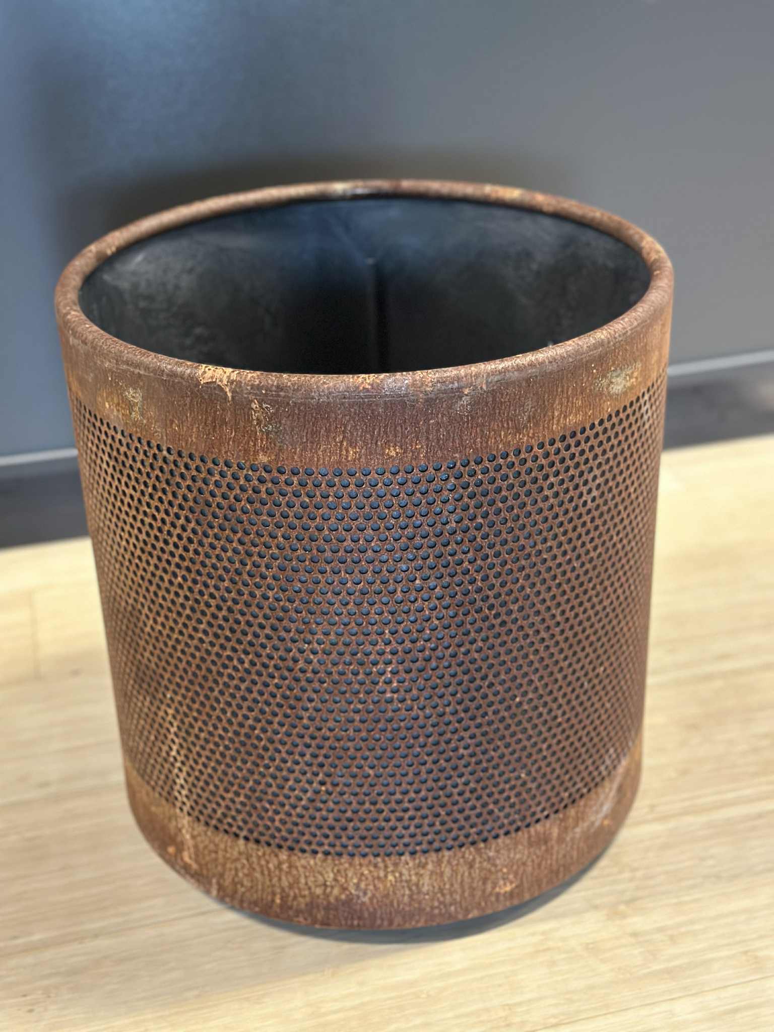 Perforeret cirkelkumme i sortstål med rustenet look. Med plastik indsats og 3 hjul.