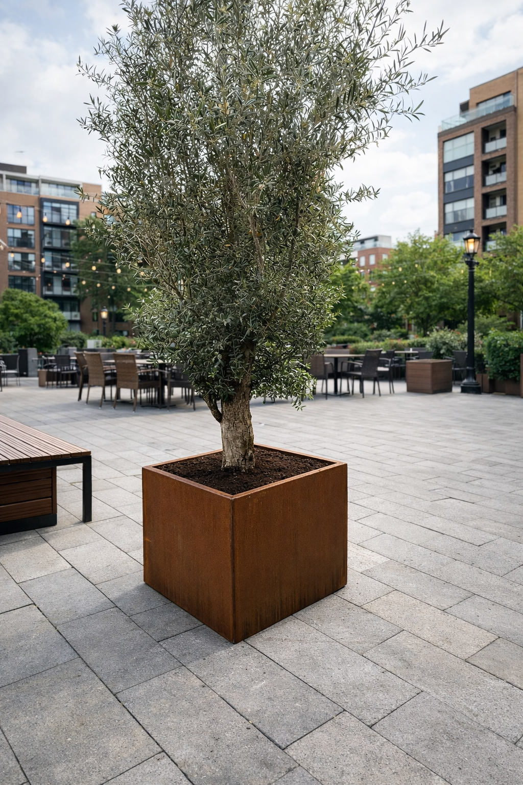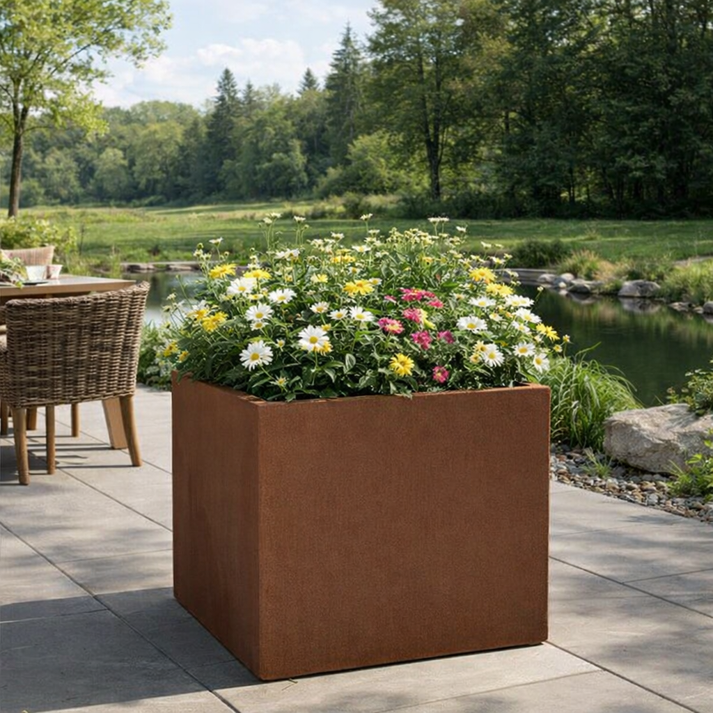 Til dine mindre træer i haven kan du nu plante dem i Hø Ståls Red Glow firkantet kumme. Kummen er designet i holdbart 2 eller 3mm cortenstål, som garanterer en lang levetid under alle vejrforhold. Du kan flytte rundt på kummen med tilføjelsen af hjul på den indbyggede bund. Det tilføjer en vis fleksibilitet for indretningen af din have.