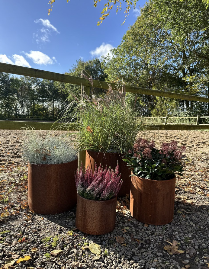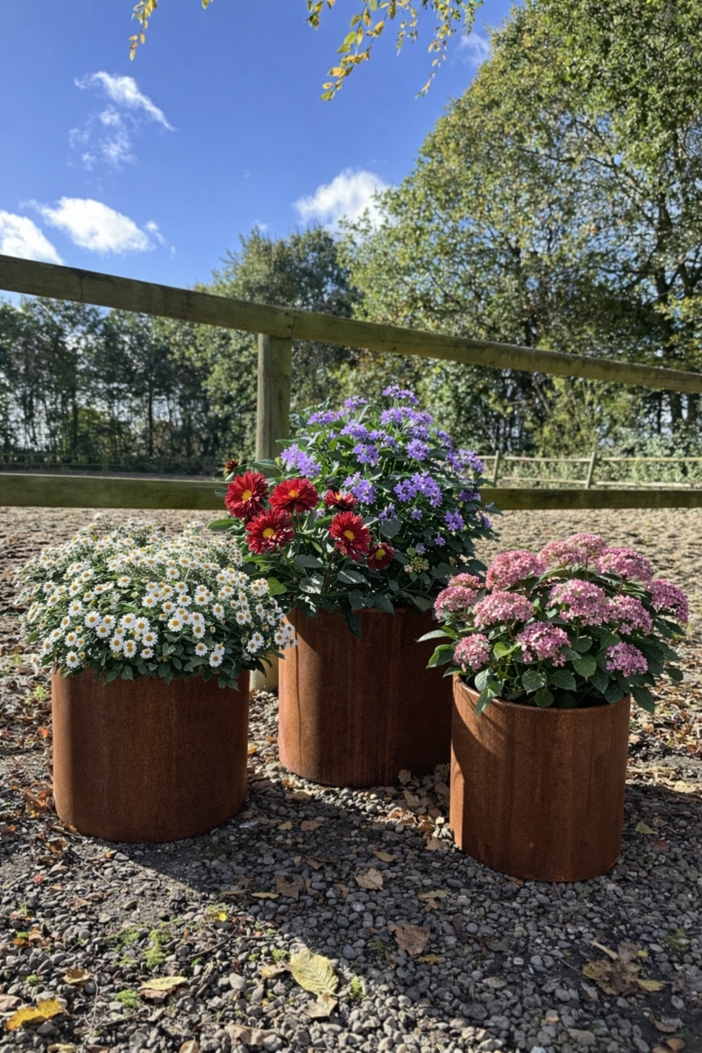 Red Glow Cirkelkumme fås i flere størrelser, hvilket åbner for placeringer flere forskellige steder i din have. Du kan vælge mellem størrelserne og sammensætte dem efter dit behov, så det passer til dit udendørs rum. Du kan yderligere tilpasse plantekummen med en genanvendelig plastindsats og hjul, hvis det ønskes, hvilket gør den nem at flytte og passende til forskelligartede havearrangementer.