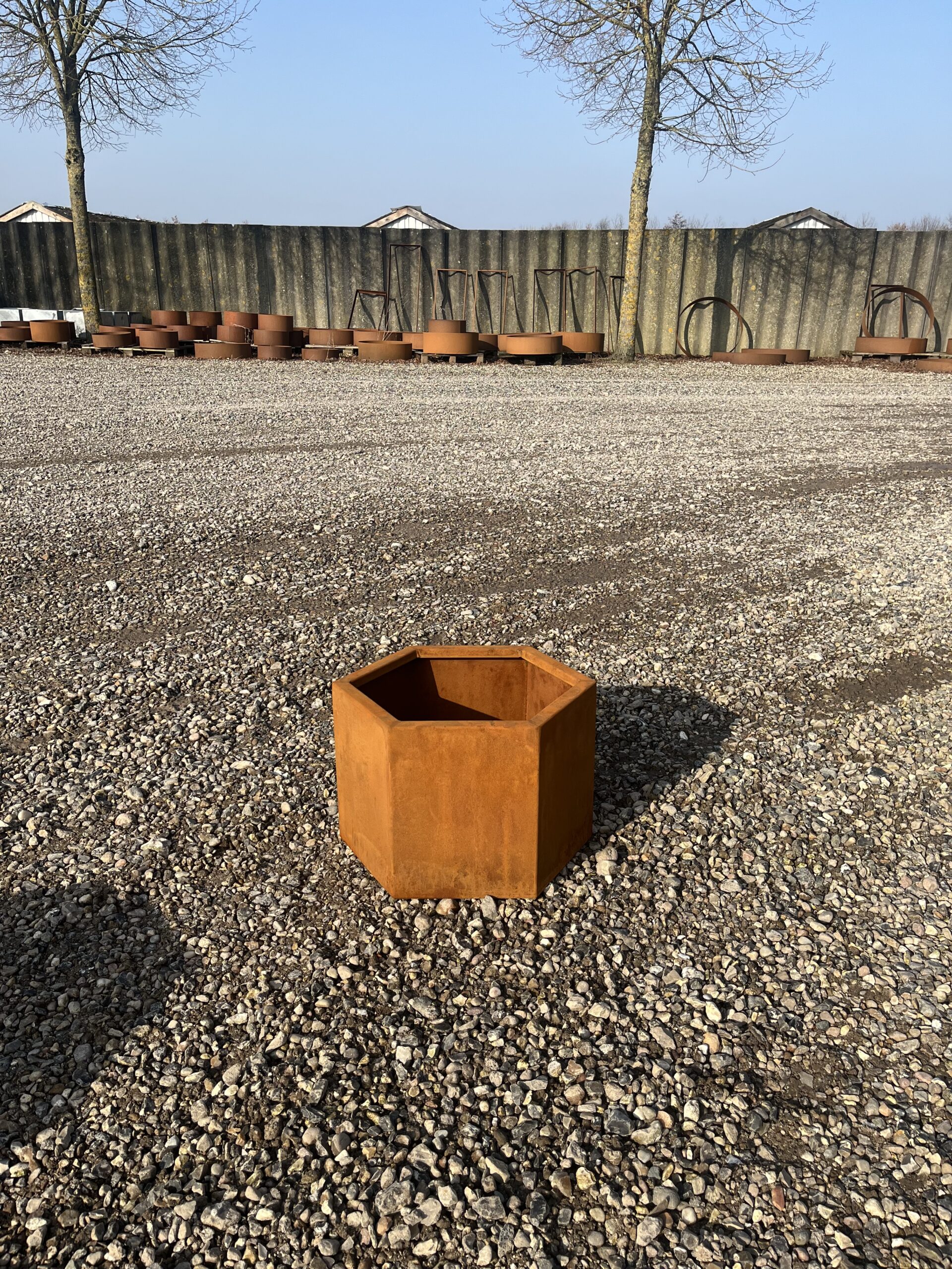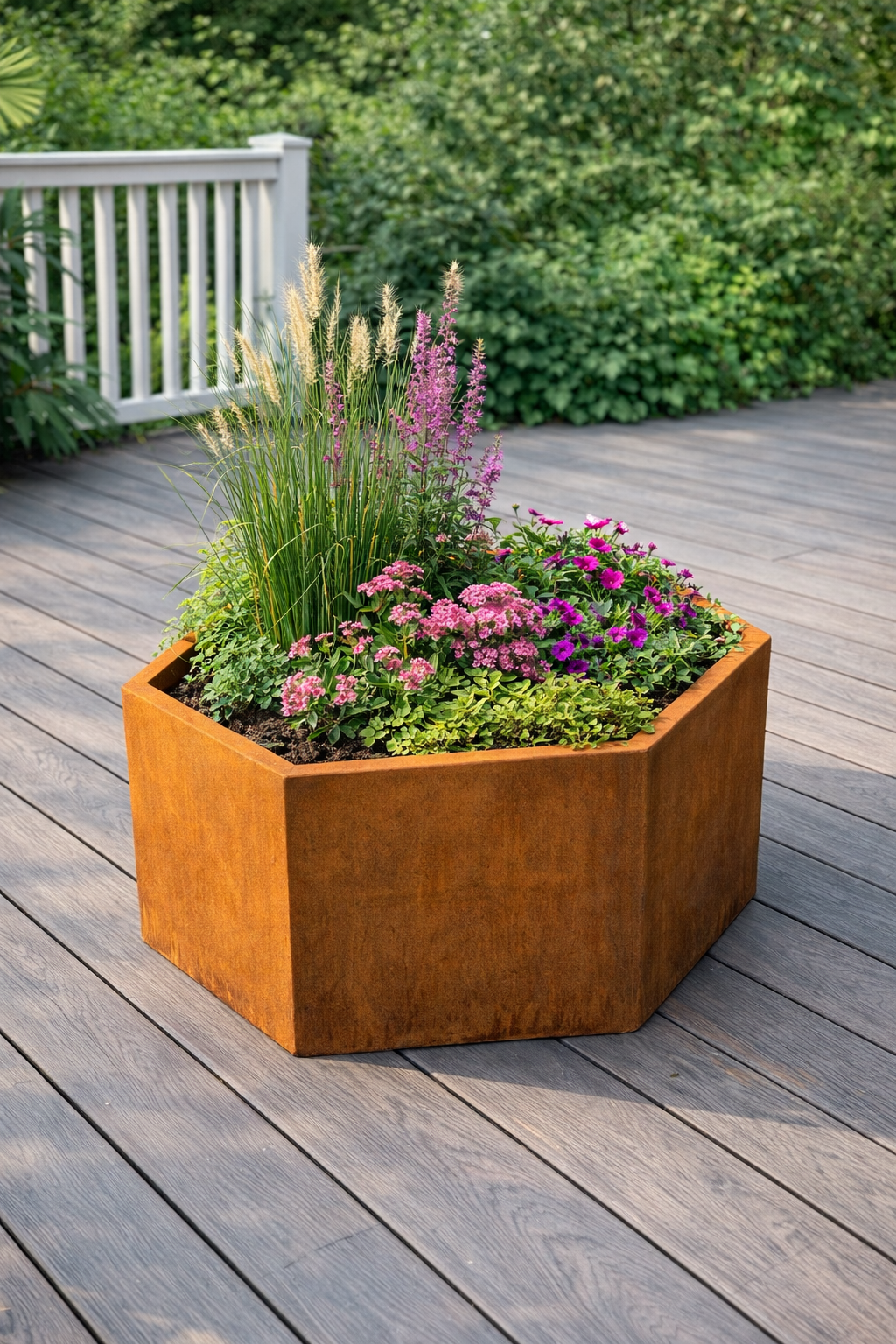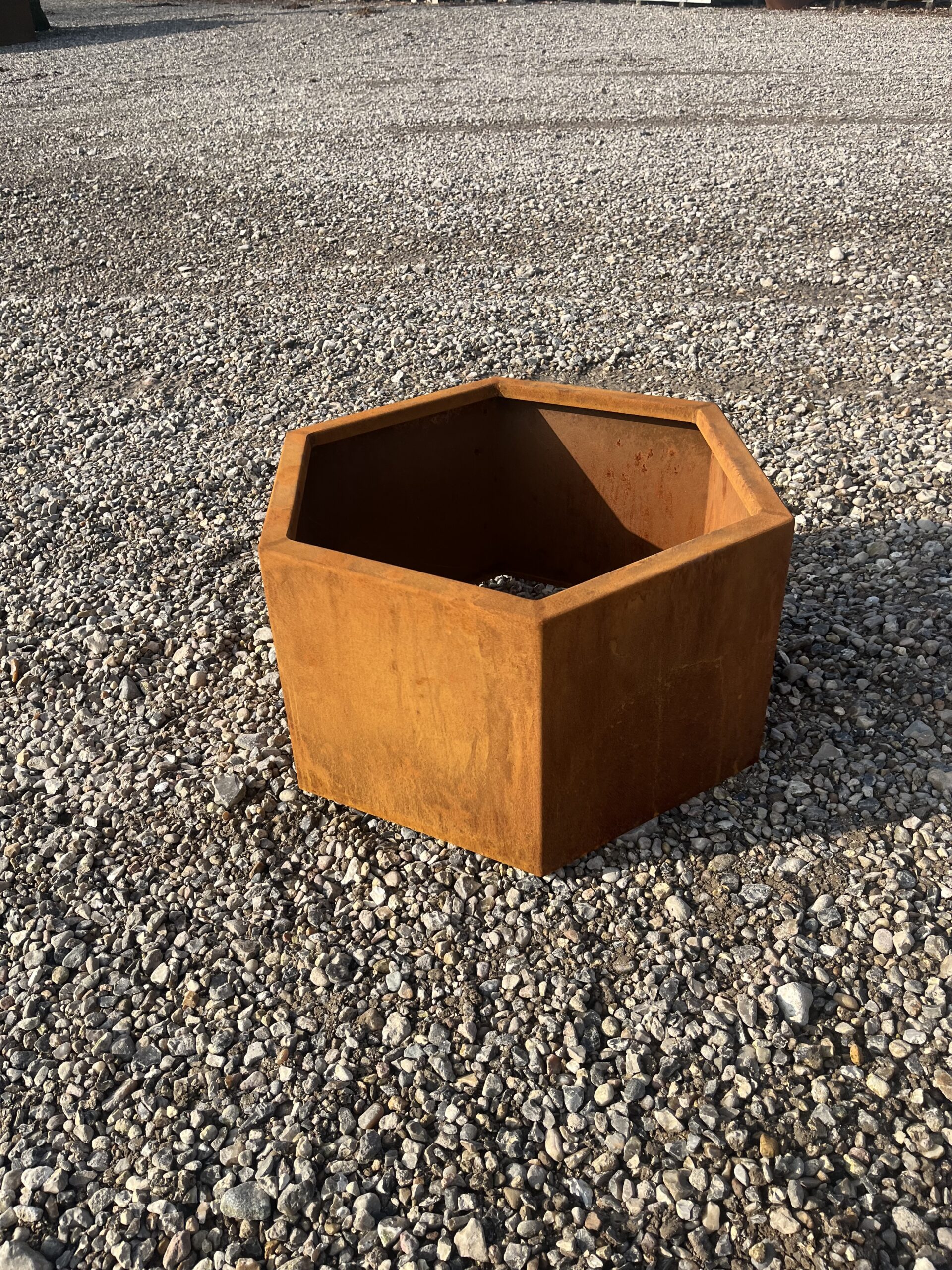 Med HØ Ståls Red Glow Hexagon kummer får du en plante- og blomsterkumme, den passer til ethvert udendørs miljø med et funktionelt og et visuelt tiltalende design. Blomsterkummen er fremstillet af 2 mm tykt cortenstål med en dobbelt bukket top kant, der garanterer holdbarhed under alle vejrforhold.